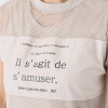 前身頃は布帛素材で切り替え、ロゴプリントをほどこして、デザイン性を高めました。