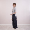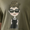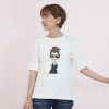 当ブランドのひがし紀子氏が自筆で自画像を描き、それを転写プリントし、スパンコールの髪飾りとクリアーなラインストーンのペンダントトップを手付けした非常に手間暇かけた胸元のモティーフが印象的。