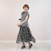 襟周りと前中心のV字切り替え部分はブラックカラーの無地のフライス素材で切り替えたトレーナー風デザイン。
