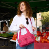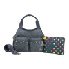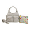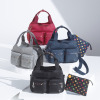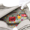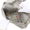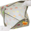 はっ水加工をほどこした無地生地をメイン使いし、ハンドルグリップや裏地などにフルーツモティーフの生地を使用したデザインです。