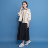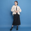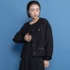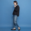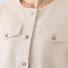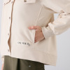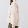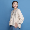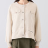 クルーネックラインのノーカラーデザインで女性らしい柔らかさを演出しつつ、フェイクフラップやヨーク切り替えでGジャンの雰囲気を表現。