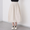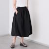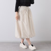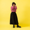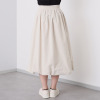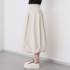 ウエストは総ゴム仕様で、幅広のウエストベルトに細かくステッチを何本も入れることで、シャーリングデザインのような表情に仕上げ、トップスをインして着用してもきれいに見えるように工夫しました。