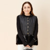 襟元と裾部分には、ツヤ感があり、しっとりとした手触りの上質なエコファーを使用。
