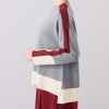 襟から袖口にかけての配色ライン、裾と袖は同系色でしっかりとした太さの配色切り替えを入れ、デザイン性を高め、個性を加えました。