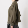 襟と裾、袖口にリブを用いたカジュアルなデザインながら、後ろ身頃には豪華でかわいらしい切り替えフリルをほどこしており、前後で異なる表情を楽しめます。