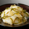 厚みがあって歯応えの良い“紋甲いか”を大きめにカットし、プチッとはじける“とびうおの卵”、彩りとして昆布(生昆布)を加えて、醤油味で味付けをした、ごはんがすすむ一品。