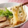 モチモチ食感とつるつるののど越しが特徴の熟成中太ちぢれ麺がスープとよく絡みます。