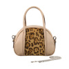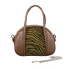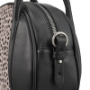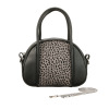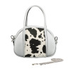 アニマル柄のハラコ風素材が特徴。取り外し可能なチェーンストラップ付きで、アクセサリー感覚で使用可能。
