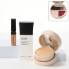 メイク効果でキメ細かいフラット肌を演出するファンデーションパレット、化粧下地、リキッドアイシャドウ。