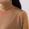 袖にフェザーヤーン(毛足の長い糸を使った素材)を編み込んだナローシルエット(全体がほっそりとしたライン)で、全体的にすっきりとした印象に。