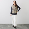 ベルトデザインの明るいプリント柄なので、一枚で着用するのはもちろん、ジャケットのインナーとして使用することで華やかさがグッと引き立ちます。