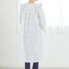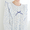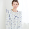 ボリュームフリルが肩幅を華奢に見せ、フリル先や袖口、ネックラインにはネイビーのトリミングをほどこし、アクセントにしました。