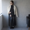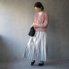 ふんわりとしたプリーツ調の加工を全体に、しっかりめのプリーツ調の加工を腰回りにかけることにより、分量感がありつつもすっきりとしたシルエットを実現しました。