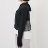 袖に大小のビジュウを配したおしゃれデザインと、フード付きで首までしっかり日差しからカバーするボレロの2枚セットです。