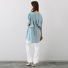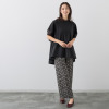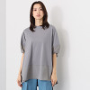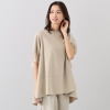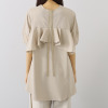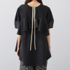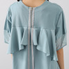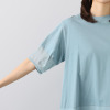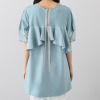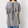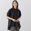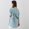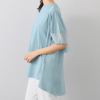 前裾と後ろヨーク下、フリル部分は布帛素材で切り替え、袖の切り替えの少し膨らみを出した部分にシアー素材を使用したこだわりデザイン。