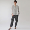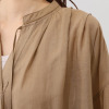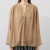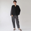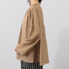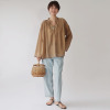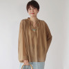ネックラインのギャザーや肩線のタック、スキッパー開きの前立てのタックにより、身頃にふんわり感とゆとりを生み出し、リラックス感のある着心地を実現しました。