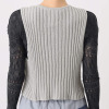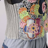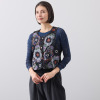 前身頃は7種類のファンシーヤーンと2種類の生地を使用し、当メーカーにある刺しゅう機でオールコード刺しゅうをほどこした、丁寧なつくり。