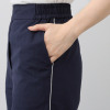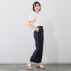 ウエスト部分は高級感を演出するため幅広に折り返し、ノータックデザインで、フロントはすっきりとしたウエスト周りを実現。