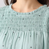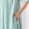 胸元のシャーリング下から広がるギャザーが、ボディー全体をふんわりと包み込みます。