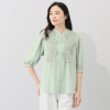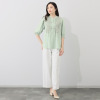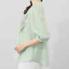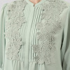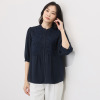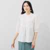 低めのスタンドカラーが繊細な表情を作り出し、胸元のヨークにはプリーツ風のピンタックを丁寧にほどこしています。