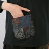 パッチワークのポケットは斜めにあしらい、使い勝手の良さとデザイン性を高めました。