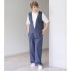 Tシャツにベストを重ねたようなデザインで、深いVネックが胸元をすっきりと見せ、視覚的にボディーラインをスマートに演出します。