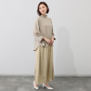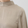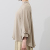 高めのスタンドカラーと着物のように重なるVネックで、おしゃれかつ着脱しやすいつくりに。