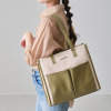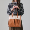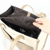キャンバス地でも角、持ち手、ポケットは合皮なのでカジュアル過ぎずに良いですね。大容量でポケットも仕切りもたくさんあってとても便利です。