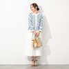切り替えなどをあえて入れず、素材のウェイト感や落ち感を計算し、バスト下から美しく広がるパターンで仕上げました。