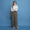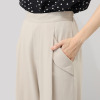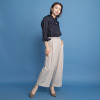 ウエスト前部は見せかけの開きとタックのみのすっきりとしたきれいめ仕立て。