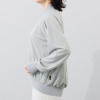 袖はラグランスリーブで動きやすく、サムホール付きで手の甲までしっかりカバーします。