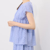 ラウンドネックと袖口は無地生地でパイピングをほどこし、すっきりとした印象に。