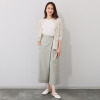 シルクのような肌触りが特徴の再生繊維(セルロース)と清涼感のある麻を混紡した糸、さらに、ラメ糸も加えて編み立てた、キラキラと煌めく光沢が華やかなニット素材を使用。
