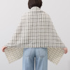 約158×64cmの大判サイズは、首に巻くだけでなく、付属のボタンを活用してポンチョ風にアレンジすることも可能。