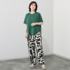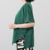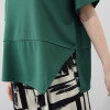 一見、シンプルなTシャツながら、斜めに角度をつけたアシンメトリーなヘムラインと、片側に入れたしっかりとした深さのあるカッティングが、腰高効果をもたらし、スタイルアップ見えも。