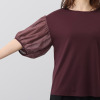 透け感のある繊細なチュール素材を二枚重ねたバルーンスリーブがポイント。