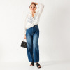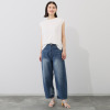 裾に向かって緩やかに細くなるバレルデザインは、スニーカーにもパンプスにも合わせやすく、幅広いスタイリングで活躍しそうです。