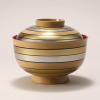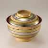 〈ブルーミング中西〉より、金色や銀色のラインをあしらった、山中塗り宝独楽蓋付き椀です。