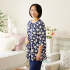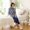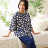 トップスは可憐なマーガレット柄をプリントし、襟ぐりにサテンのバインダーとギャザーをほどこして女性らしい印象に。