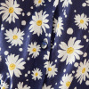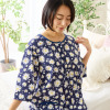 可憐なマーガレット柄をプリントし、襟ぐりにサテンのバインダーとギャザーをほどこして女性らしい印象に。