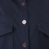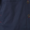 赤い糸を使用したボタンホールとカンヌキ止め、さらに一つだけ異なるクルミボタンを用いるなど、遊び心と品の良さが光ります。