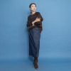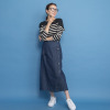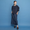 縦長のシルエットがスタイリッシュな印象を与えながらも、前はすっきりとしたデザイン、後ろはゴムギャザー仕様で、見た目の美しさとはき心地の良さを両立。