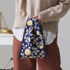 最初は、柄のない方を購入しようかと思っていたのですが、柄が気に入って、こちらにしました。ネイビーに黄色の花柄が可愛いです。生地も思っていたよりしっかりしています。長財布、ポーチ、ハンドタオルを入れてみました。底もキープできて、型崩れしませんでした。私の持ち歩くサイズとするなら、あと横幅が4、5センチ長いと、ゆとりがあってメガネケースなどもしっかり収まるかなぁと思いました。ただコンパクトなこの大きさが可愛いのかもしれません^ ^