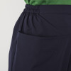 ウエスト部分には、脇から後ろにかけて柔らかくキックバックの良いゴムを使用し、真ん中をステッチで押さえることで、ゴムがひっくり返らないように工夫しました。