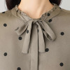 上品さとトレンド感が融合したドットの魅力。襟のフリルと長めのボウタイで、女性らしさを引き立てます。