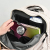 フロントの上部にスマートフォンなどの小物を収納できるファスナーポケットを配し、内側にナスカン付きストラップを配しているのでカギなどの迷子を防止。