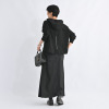 身頃は程良いゆとりのあるモダンなシルエットながら、両脇に斜めに角度をつけたサテンパイピングをほどこすことで、視覚的な細見え効果を狙いました。