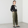 ヒップからひざ下まで適度なボリュームを持たせながらも、ひざ下に切り替えを入れ、裾へ向かって細くなるデザインで、リラックス感とすっきり感を両立。