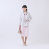 3D立体パターンで、背中心とプリンセスラインにダーツを取り、より美しいシルエットを追求。ウエストは程良くシェイプさせることでほっそりと見えるように考慮しました。ヘムラインは斜めに引き返し編みで自然に仕上げました。後ろ裾がやや短いことで、美しいバックスタイルを演出します。