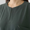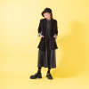 前中心の切り替え線と左胸の大きめパッチポケットで、モード感と細見え効果を狙いました。